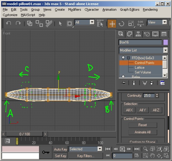 6. Now select control points at Lower Left and Lower Right corners by making selection window. Make sure that you do not select any control point in mod. Notice the arrow marks A and B in the image below. Then move the control points a bit toward end as marked C and D.
